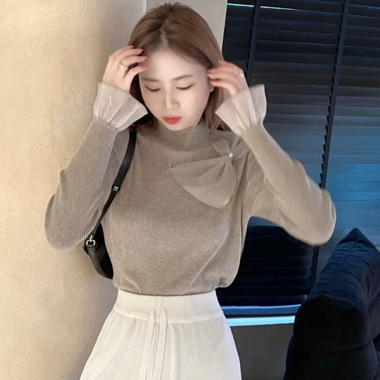 リボンモチーフと袖口のチュールレースが可愛いリブニット
