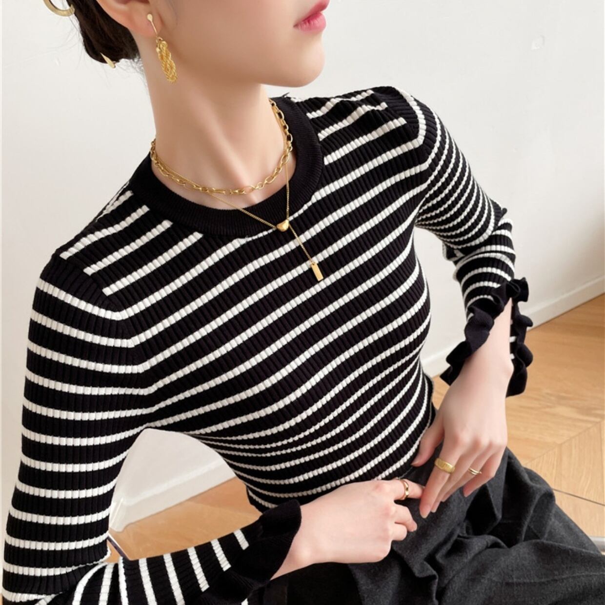 レディース トップス ニット フリルボーダーリブニット ミドル丈 リブ プルオーバー シンプル ボーダー 袖あり 長袖 フリル スリット ラウンドネック ガーリー エレガント 大人カジュアル カジュアル フェミニン ブラック お洒落 春 秋 秋冬 ママ ママコーデ 20代 30代 40代 デート お出かけ 普段使い 韓国 トレンド 可愛い 大人 大人女子 大人可愛い 通勤 通学 学生 女子会 着回し デイリー こなれ感 レイヤード 定番 上品 きれいめ スリム 華やか